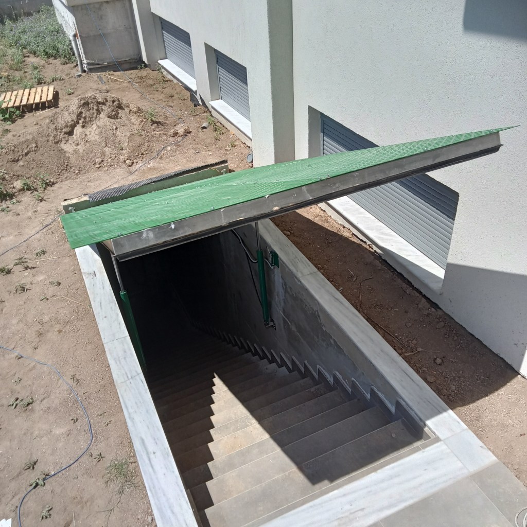 Καταπακτή σε υπόγειο, με υδραυλικό σύστημα ανύψωσης, στεγανή, με αυτόματο χειρισμό, με τηλεκοντρόλ και χειρισμό μέσω Wi-Fi.